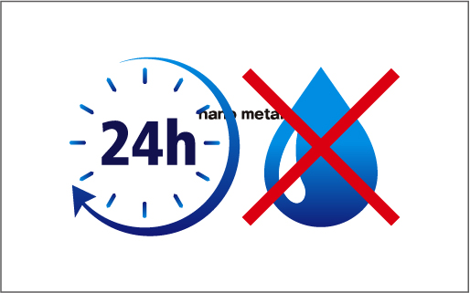 コーティング光沢・防汚層(ガラス皮膜)の上にナノ化したレアメタルの金属皮膜が結合し強靭な膜を作り、さらにコーティング撥水・滑水層によってウォータースポットやイオンディポジットの付着を防ぎます。